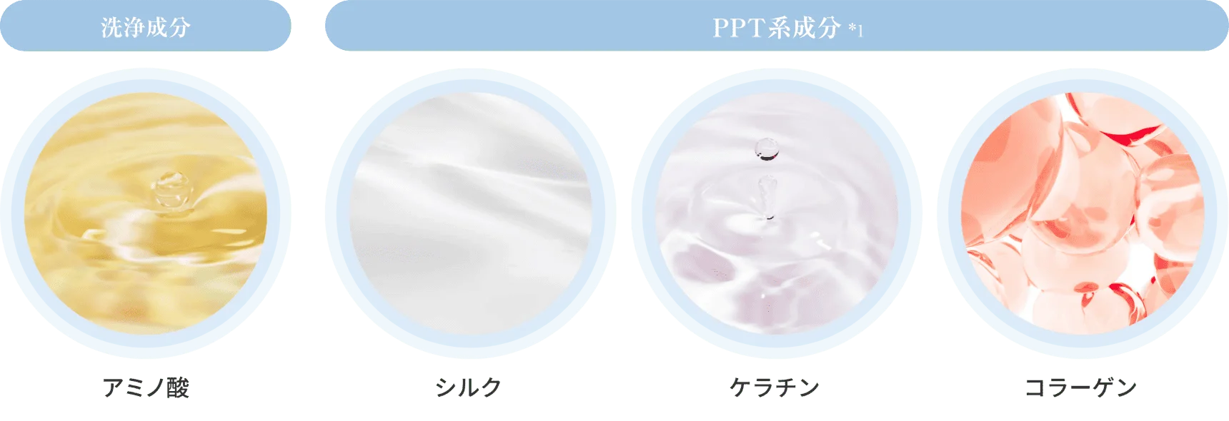 2種類のアミノ酸系洗浄成分と2種類のPPT系洗浄成分が、補修しながらやさしく洗浄。